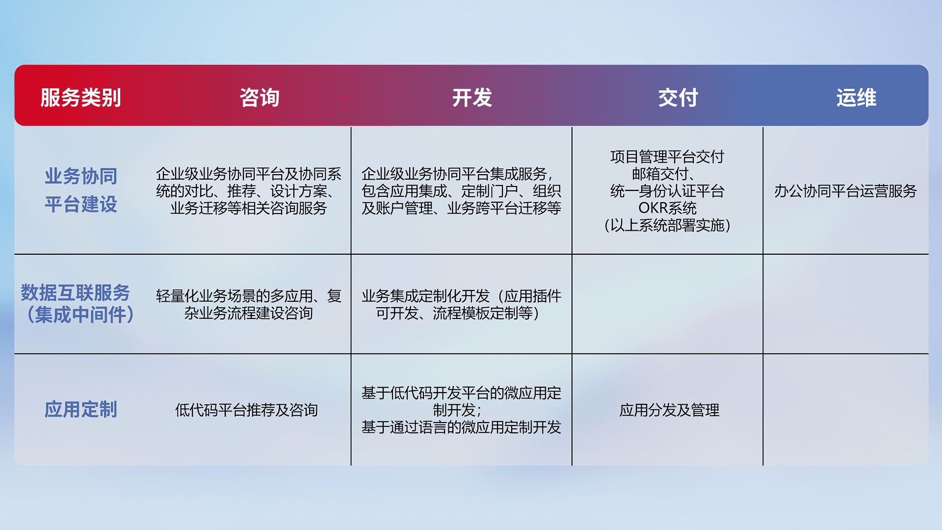 针对钉钉、、、企微、、、、IDaas等平台级产品提供产品的规划、、、方案、、、、交付、、定制化开发等服务,,实现如统一协同办公、、、智能客户服务、、、混合会议管理、、、、智能数据查询、、、等业务场景,,,,实现数字化转型。。。